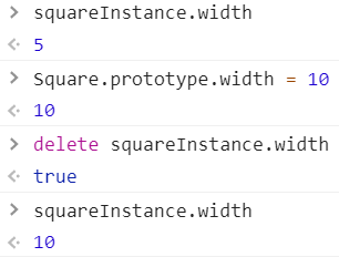 여기서 이 클래스 구현 방식에 문제가 있습니다. 인스턴스의 프로퍼티에 height와 width가 존재해야 맥락상 이치에 맞지만, Square.prototype에 값이 있습니다. 이렇다면 이후에 임의로 Square.prototype.width에 값을 설정하고 squareInstance.width의 값을 삭제한다면, squareInstance.width의 접근 결과는 undefined가 아니라, 프로토타입체이닝에 의해 다른 어떤 엉뚱한 값이 반환될 것입니다.