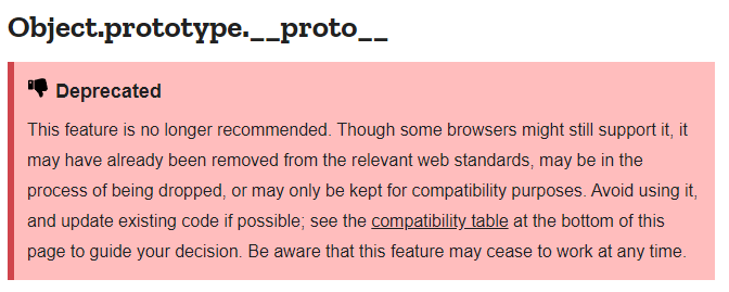 - mdn 문서를 보면 더 이상 지원되지 않는다고 쓰여 있다.사실 Object.prototype.__proto__만이 아니라, 즉 자바스크립트의 모든 객체에서 던더프로토로 프로토타입 내부슬롯사실 Object.prototype.__proto__만이 아니라, 즉 자바스크립트의 모든 객체에서 던더프로토로 프로토타입 내부슬롯에 접근하지 말라는 것과 같다.