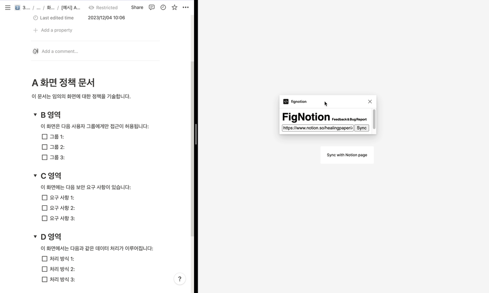 여러 시행착오를 거쳐, 업무 시간 외 시간으로 약 2주 동안 FigNotion 프로토타입을 만들 수 있었습니다. 해당 프로토타입을 기쁜 마음으로 디자이너분들에게 배포했는데요. 이제 제품 스쿼드는 다음과 같이 FigNotion을 사용할 수 있었습니다.
