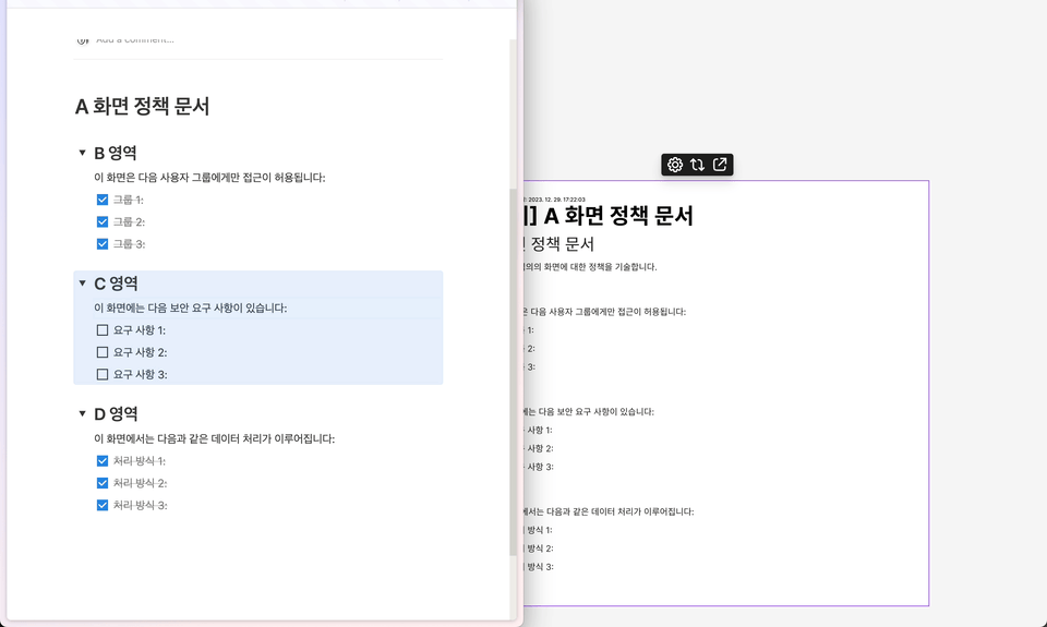 이전에는 디자인 파일에 있는 화면의 정책이 적혀 있는 문서를 찾기가 어려웠습니다. 이를테면 A 화면 디자인 파일을 봤는데, 특정 UI에 대한 정책 문서를 찾고 싶다면 방대한 노션 데이터베이스로 이동해 정책을 찾는 식이었죠. 위 문제를 해결하기 위해 제품 조직은 Figma 파일 옆에 정책 문서를 작성하기 시작했습니다.