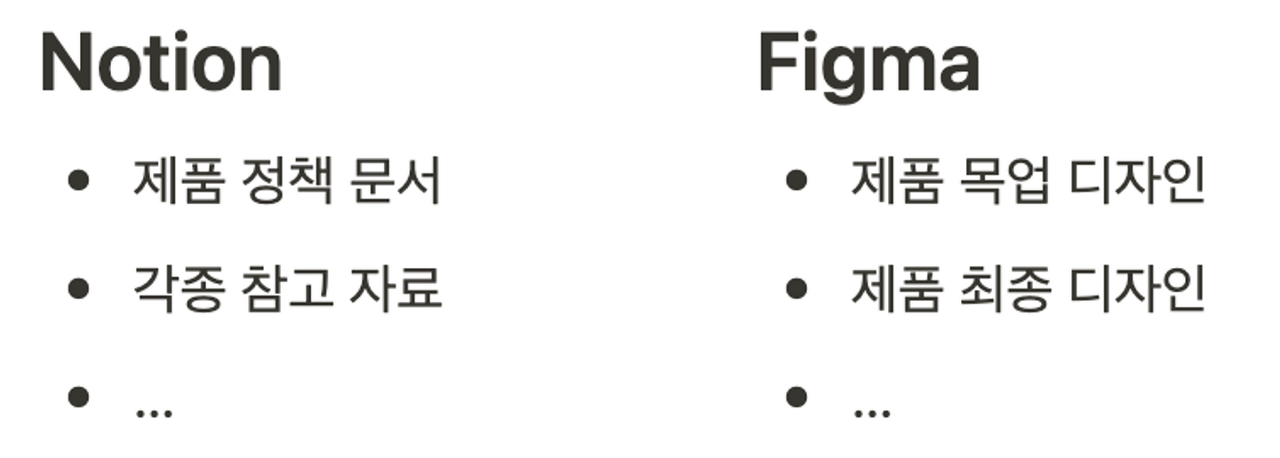 저희 회사 제품 개발 조직은 디자인 협업 툴로 Figma(피그마), 또 문서 관리 도구로 Notion(노션)을 사용하고 있습니다. 스쿼드 마다 세부적인 내용은 다를 수 있으나 일반적으로 제품과 관련된 정책은 Notion으로 관리하고 제품 디자인은 Figma에서 관리하고 있습니다.