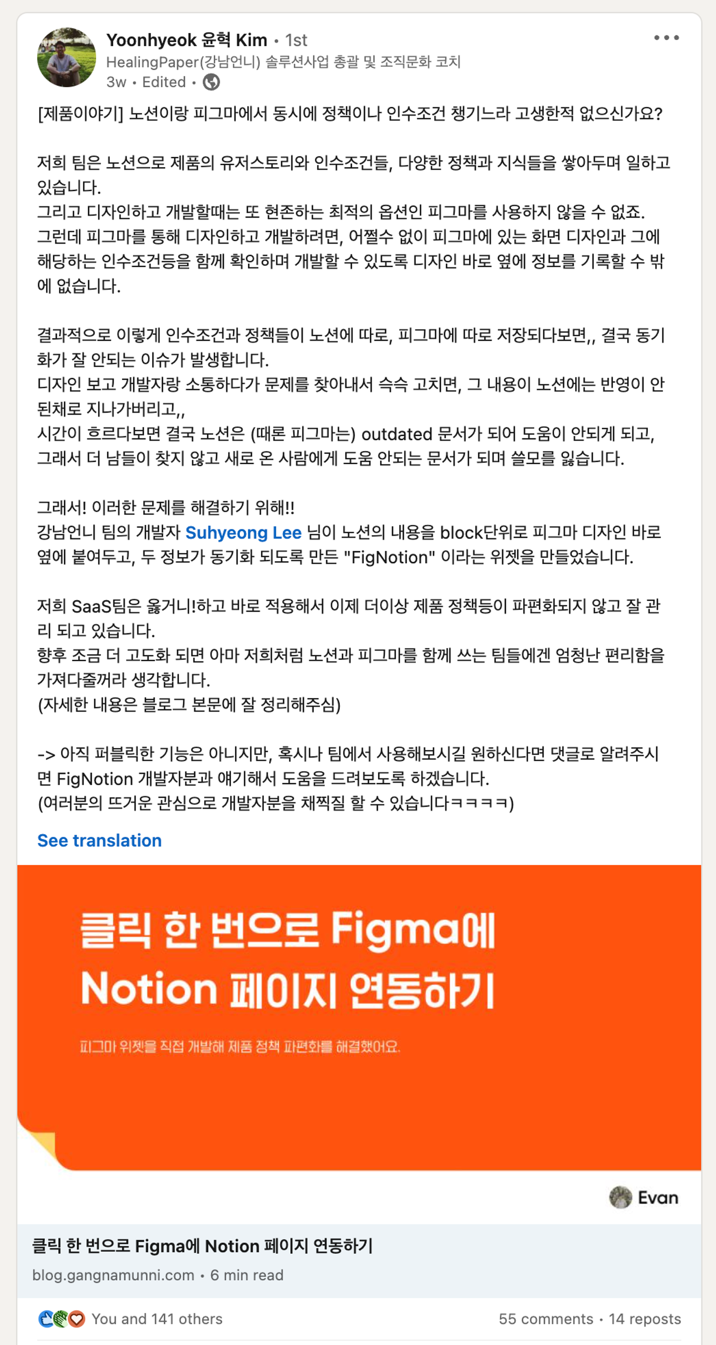 LinkedIn에서 저의 동료가 FigNotion을 홍보하면서 제 마음에 급격한 변화가 생겼습니다. 의외로 반응이 너무 좋았기 때문이죠.