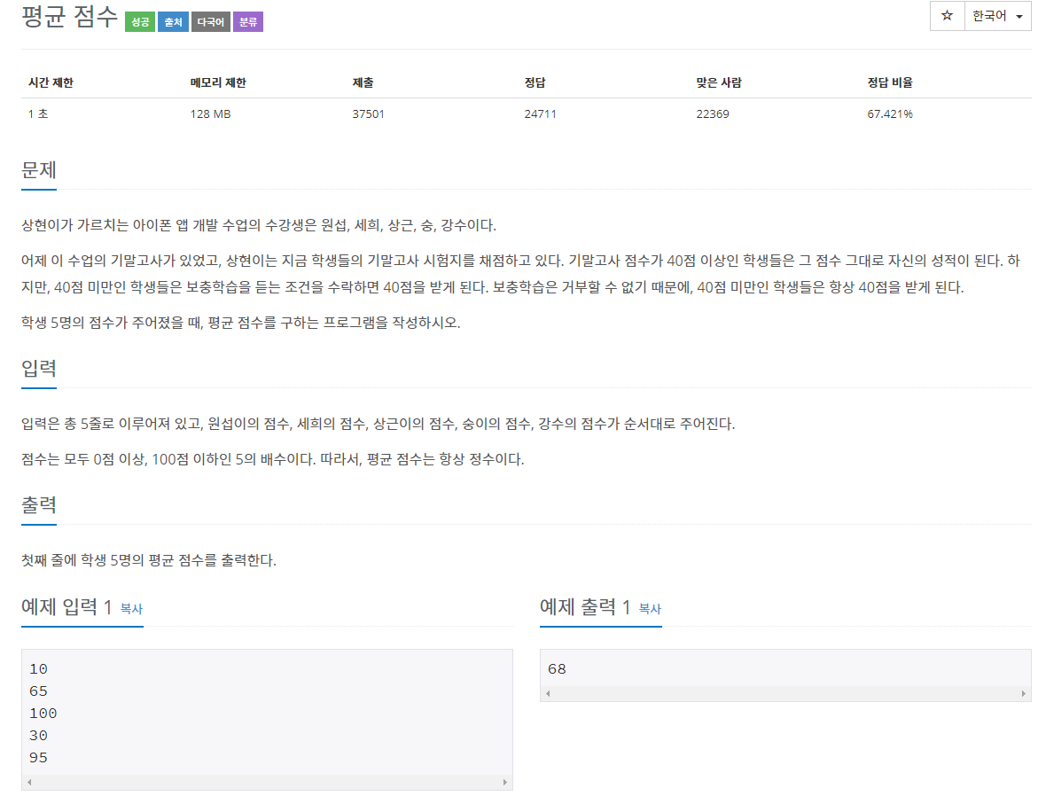 한 줄에 여러 값을 입력 받는 것이 아니라서 bufferedReader를 쓰지 않았다(그냥 빨리 풀고 싶었다). scores 라는 크기 5개 짜리 배열을 만들어 차례로 점수를 집어넣었고, 넣고 난 다음 바로 점수 크기 검사를 하여 40점 미만이면 40점으로 점수를 바꿨다. 반복문 안에서 동시에 점수 총합을 계산한 다음 출력할 때 scores 배열의 크기(5)로 나누어 평균 점수를 구했다.
