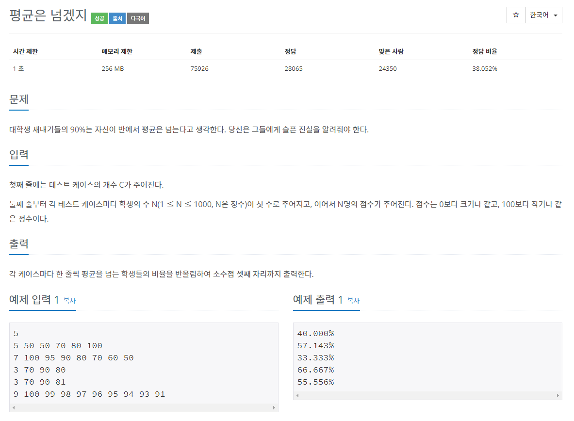 for(int j=1; j<=studentCount; j++) { // 평균을 넘는 학생 비율 구하기 (소수점 셋째 자리까지 출력)
